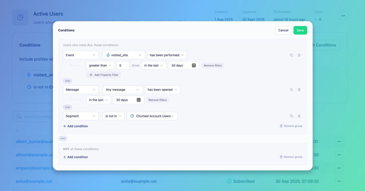 Improved: Segment validation - Enhanced validation for timestamp and number values used with comparison operators in the segment condition builder, reducing errors and incorrect results.