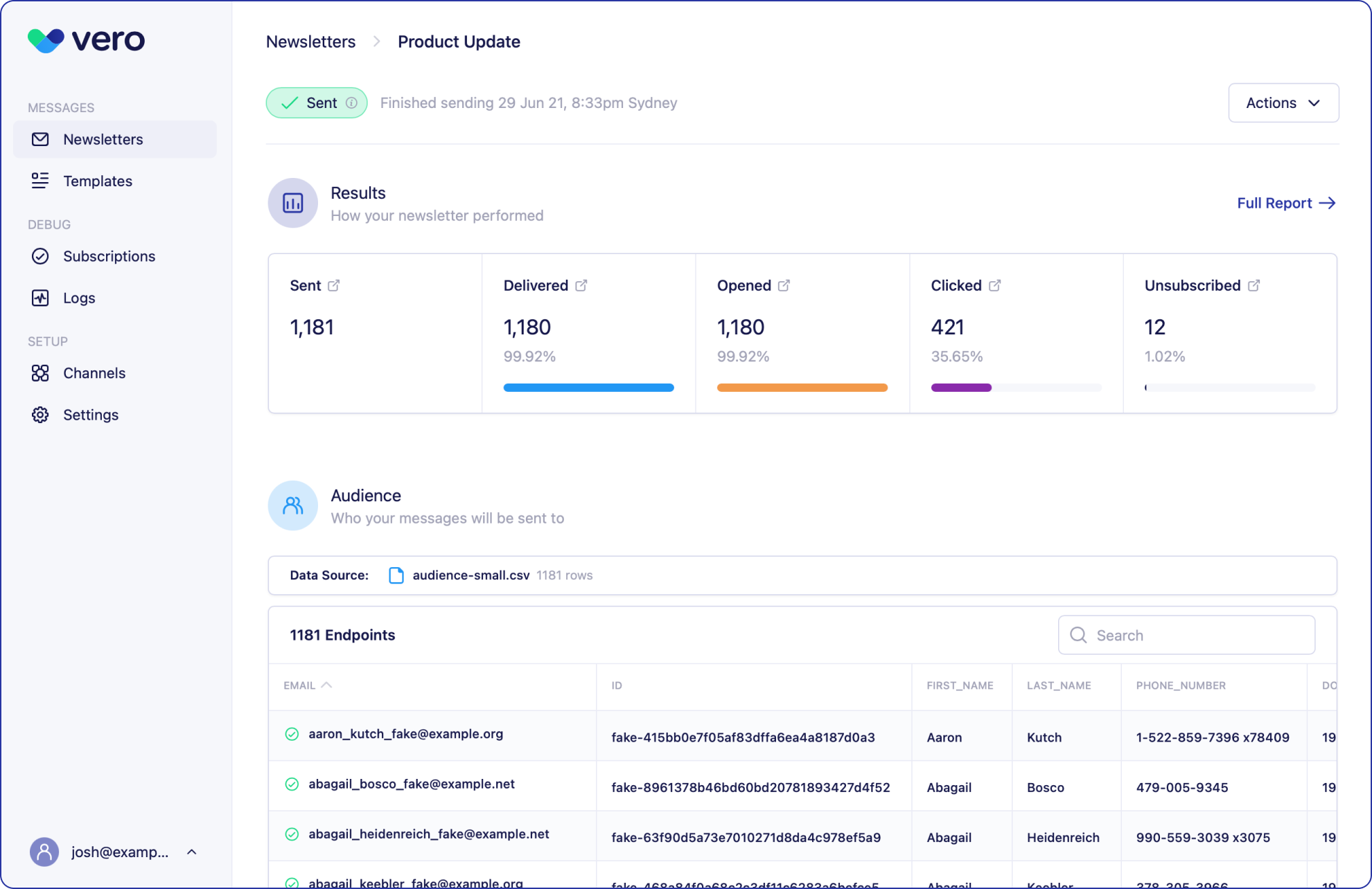 Unlike other messaging products, Vero Newsletters doesn’t store user and event-level data. Instead it connects directly to data sources that already contain your user and event-level data. This enables you to “bring your own data”, design a great message and send it to your customers in three simple steps. Whether you have CRM data in Google Sheets, Airtable, Segment Personas, Looker, Redshift, Snowflake or anywhere else, our new Newsletters product provides a simple, powerful way to message customers.