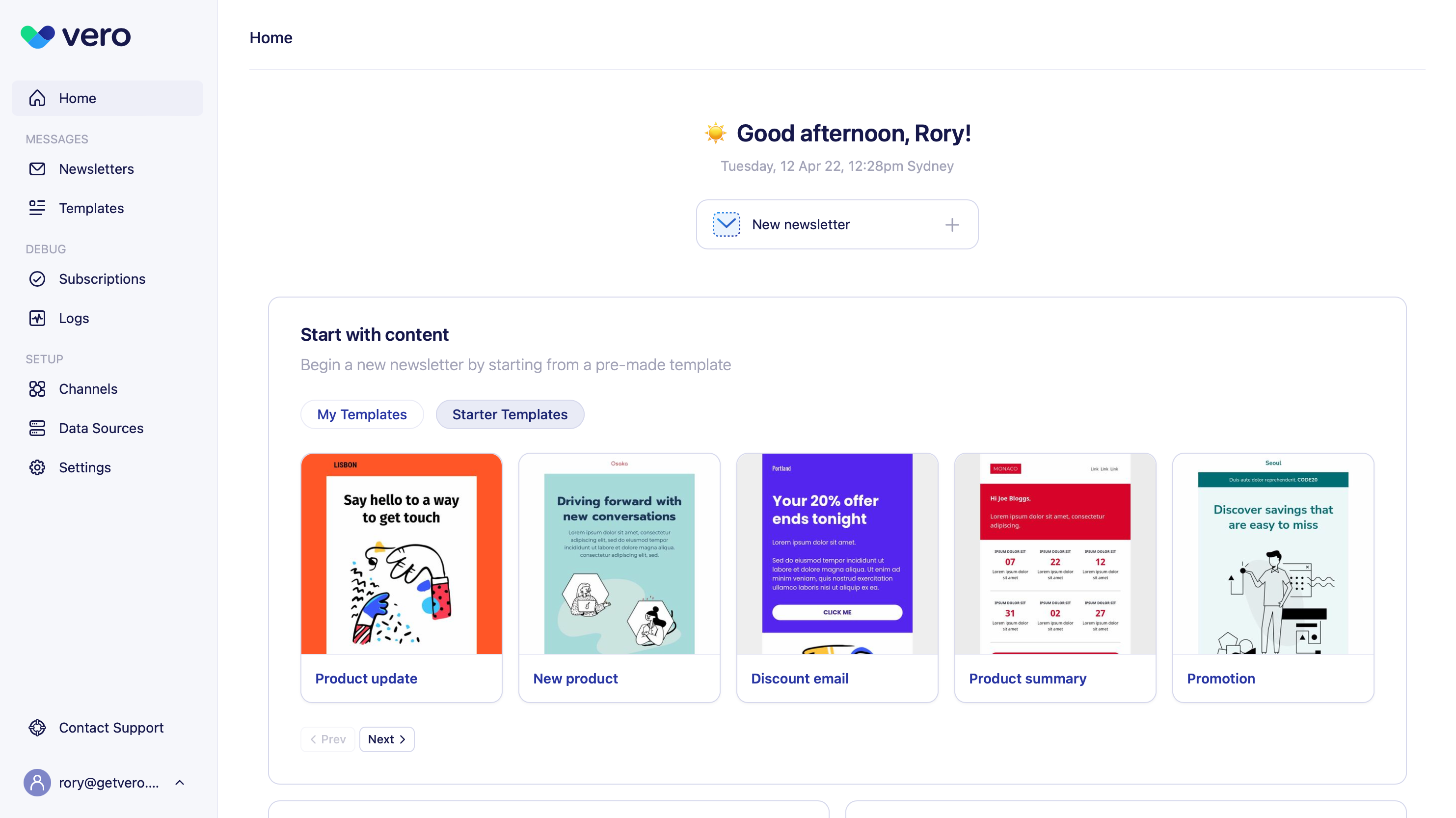 We’ve added a new “Home” page to Vero Newsletters. This is the first page you’ll see every time you login to the Newsletters app from now on and has some useful shortcuts and widgets that help get you started quicker and show an overview of your activity. The biggest widget adds quick links to some starter templates or your own custom templates giving you a quick way to dive in and start editing the content for your next send.