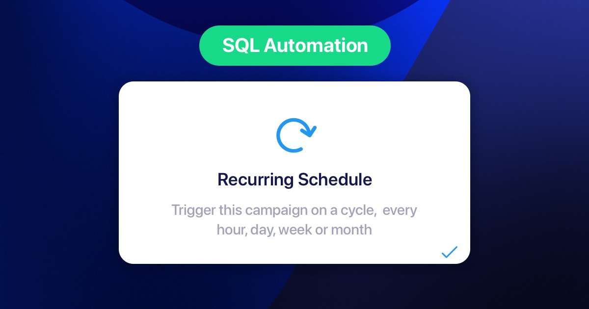 Scenario 2: Imagine you want to send a message to every user who signed up in the last hour. Simply set your campaign to send on a recurring schedule every hour and then write a SQL query that finds users who signed up within the last hour. With direct access to your data warehouse and the ability to run a query on a recurring schedule, you can simplify your onboarding campaigns and trust that the data powering them is always on point.We’re excited for you to try this feature out and we look forward to seeing all the ways you use it to send campaigns using data accessed directly from your data warehouses and data stores.