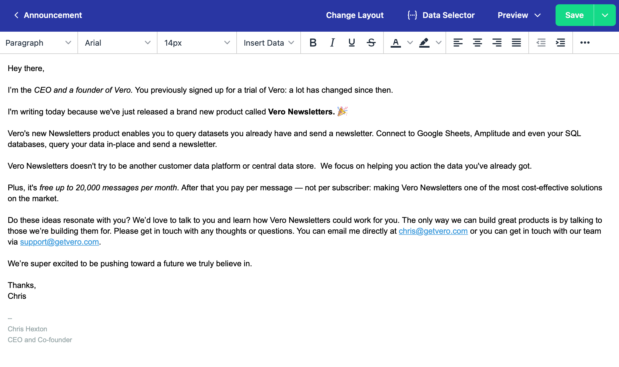 We've added a rich text editor for composing message content in the Newsletters product. The new rich text editor enables you to send messages that look as close as possible to a personal email with an interface similar to what you would use in Gmail, or any other email client.